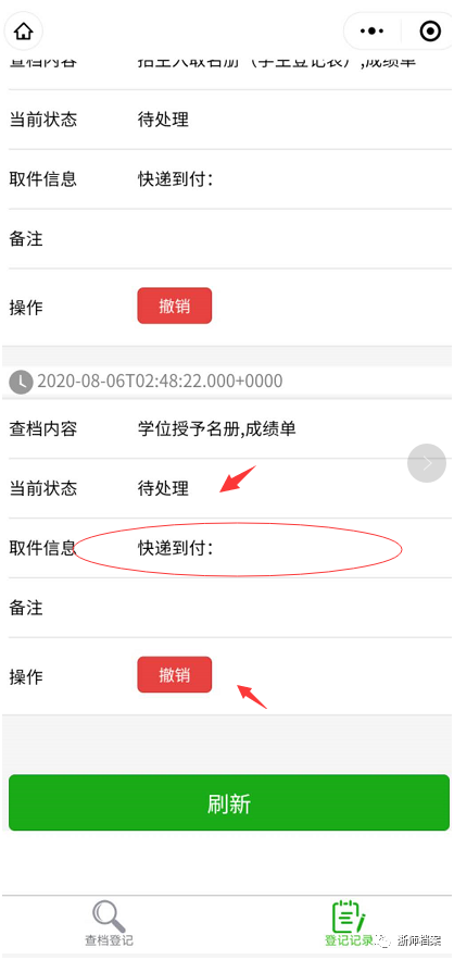 步骤五:根据“登记记录”可关注受理状态(是否处理完成,快递信息等),或者撤销申请、评论等操作。