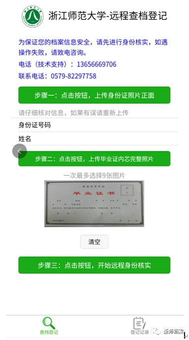 步骤三:上传身份证照片,毕业证照片,进行人物头像自拍、核对,确保是您本人发起远程查档申请。